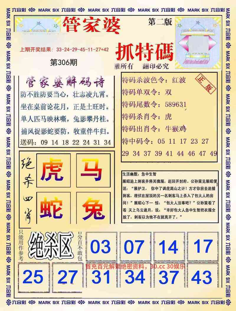307期:特码暗语/曾道人救世心经/攻特料/六合心经/平码生肖点将